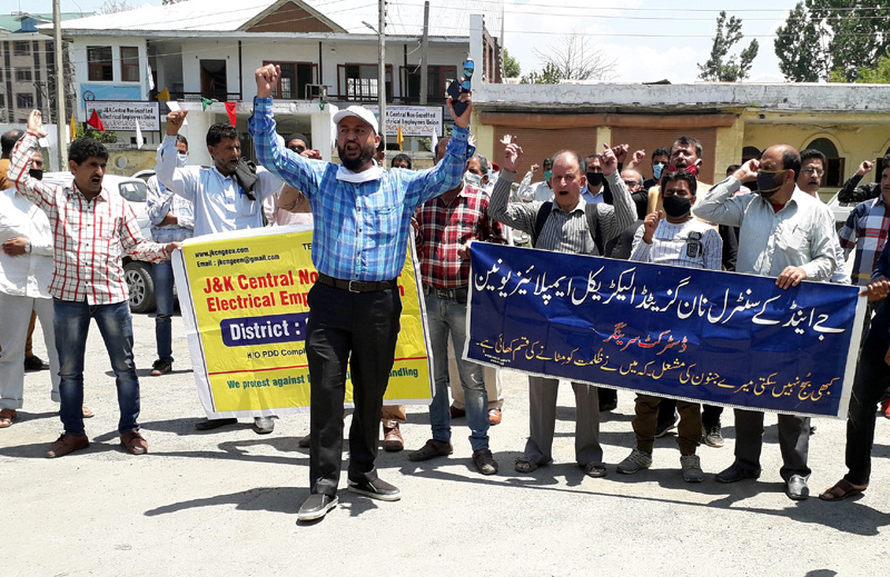 J&K Central Non Gazetted Electrical Employees Union holding a protest demonstration in Srinagar. —Excelsior/Shakeel By Daily Excelsior - June 17, 2020 Share FacebookTwitterWhatsAppPinterestLinkedinCopy URLTelegramEmailTumblrReddItPrintKoo J&K Central Non Gazetted Electrical Employees Union holding a protest demonstration in Srinagar. —Excelsior/Shakeel J&K Central Non Gazetted Electrical Employees Union holding a protest demonstration in Srinagar. —Excelsior/Shakeel Follow our WhatsApp channel