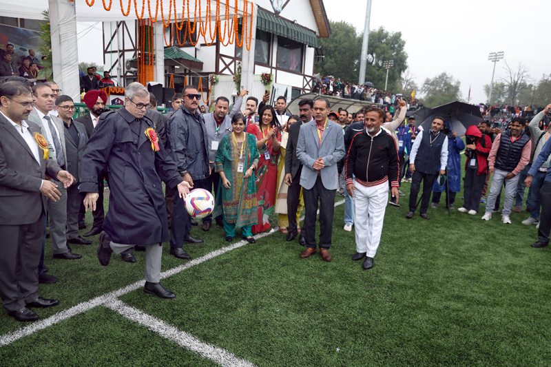 Chief Minister Omar Abdullah displaying his football skills during the inauguration of the 69th National School Games in Srinagar on Monday.-Excelsior/Shakeel