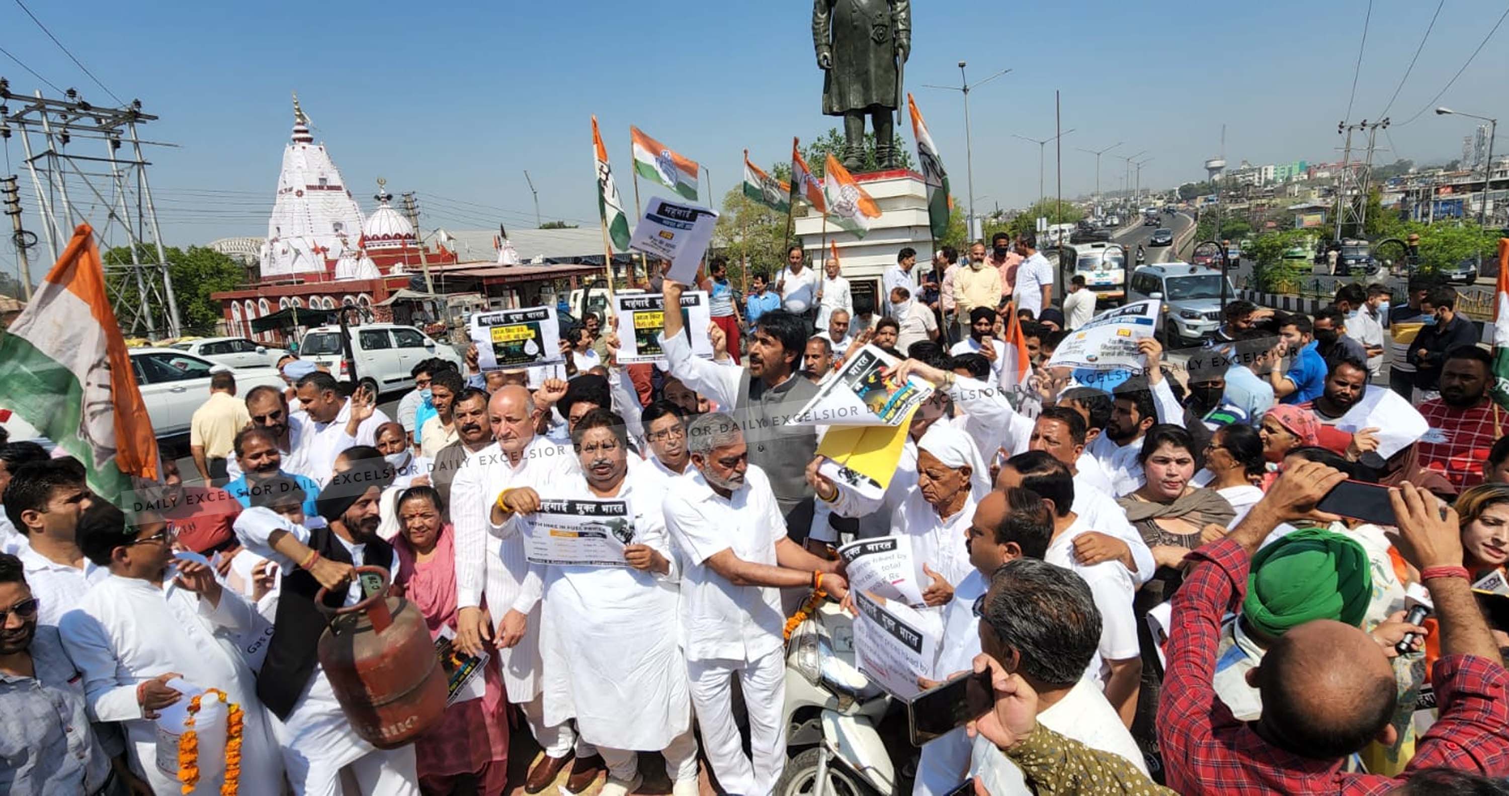As part of a nationwide protest call, a large number of Congress workers led by Mir assembled in Tawi Bridge area carrying placards and banners and raised slogans against the central government.