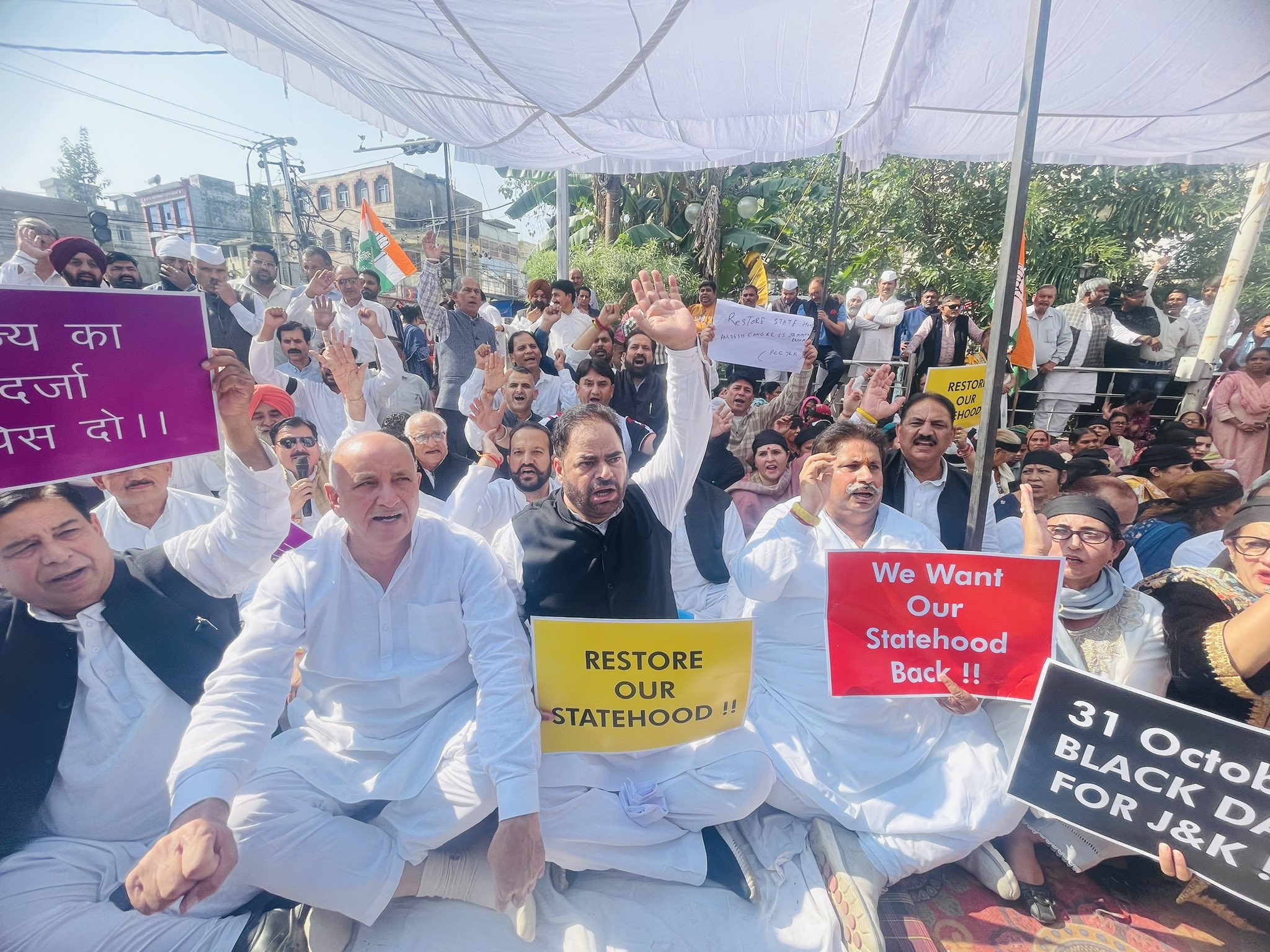 Carrying placards in support of their demand for restoration of statehood and holding of early assembly elections, the protesters, including former ministers and legislators, raised slogans against the UT administration — that held a series of functions across all the 20 districts to celebrate the day — and the BJP.
