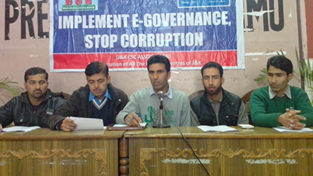 J&K CSC Association members interacting with media persons at Jammu on Tuesday.