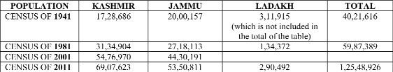 The Delimitation Commission Report of the year 1995 which rules the roost has divided the assembly constituencies of J&K state into 87 segments providing 37 seats for Jammu region whereas, 46 seats to Kashmir valley and 4 to Ladakh region. The Jammu region has an area of 26000 sq. kms and Kashmir province comprises of 15120 sq. kms. The rest, which is more than 57000 sq. kms goes to the share of Ladakh region. According to the census of 1941, the population of the state exclusive of Ladakh and Gilgit areas is tabulated hereunder alongwith census reports of 1981, 2001 and 2011.