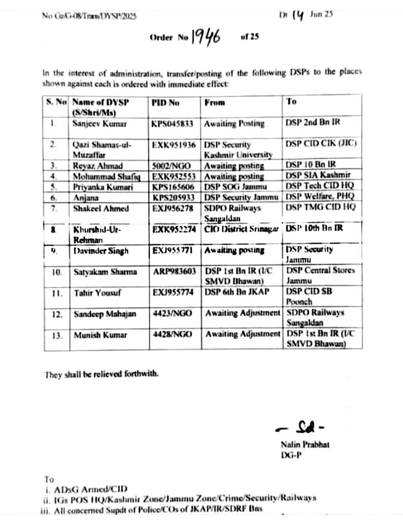 J&K DGP Nalin Prabhat Transfers 13 DySPs By Daily Excelsior - June 19, 2025 Share FacebookTwitterWhatsAppPinterestLinkedinCopy URLTelegramEmailTumblrReddItPrintKoo JAMMU, Jun 19: The Director General of Police (DGP), Jammu and Kashmir, Nalin Prabhat has ordered the transfer and posting of 13 Deputy Superintendent of Police (DySP) ranked officers. Follow our WhatsApp channel