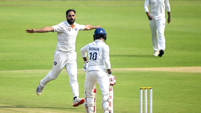 Madhya Pradesh, reeling at 84 for 5 at Saturday’s close with Auqib having taken 3/23, saw the pacer return to finish the job, first dismissing Ramveer Gurjar (11) and then breaking the resistance of Saransh Jain, who had stood firm with an 81-ball 64 to keep the MP innings alive.