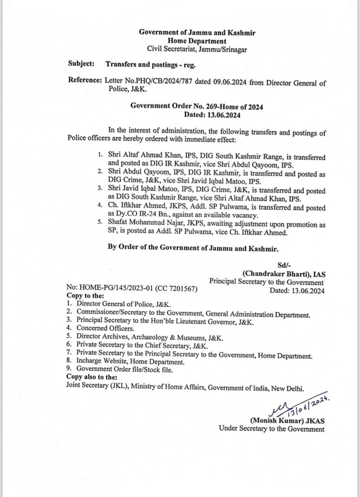 3 IPS Among 5 Police Officers Transferred By Daily Excelsior - June 13, 2024 Share FacebookTwitterWhatsAppPinterestLinkedinCopy URLTelegramEmailTumblrReddItPrintKoo JAMMU, June 13: Jammu and Kashmir Government today ordered the transfer and posting of 5 senior police officers, three of them IPS. Follow our WhatsApp channel