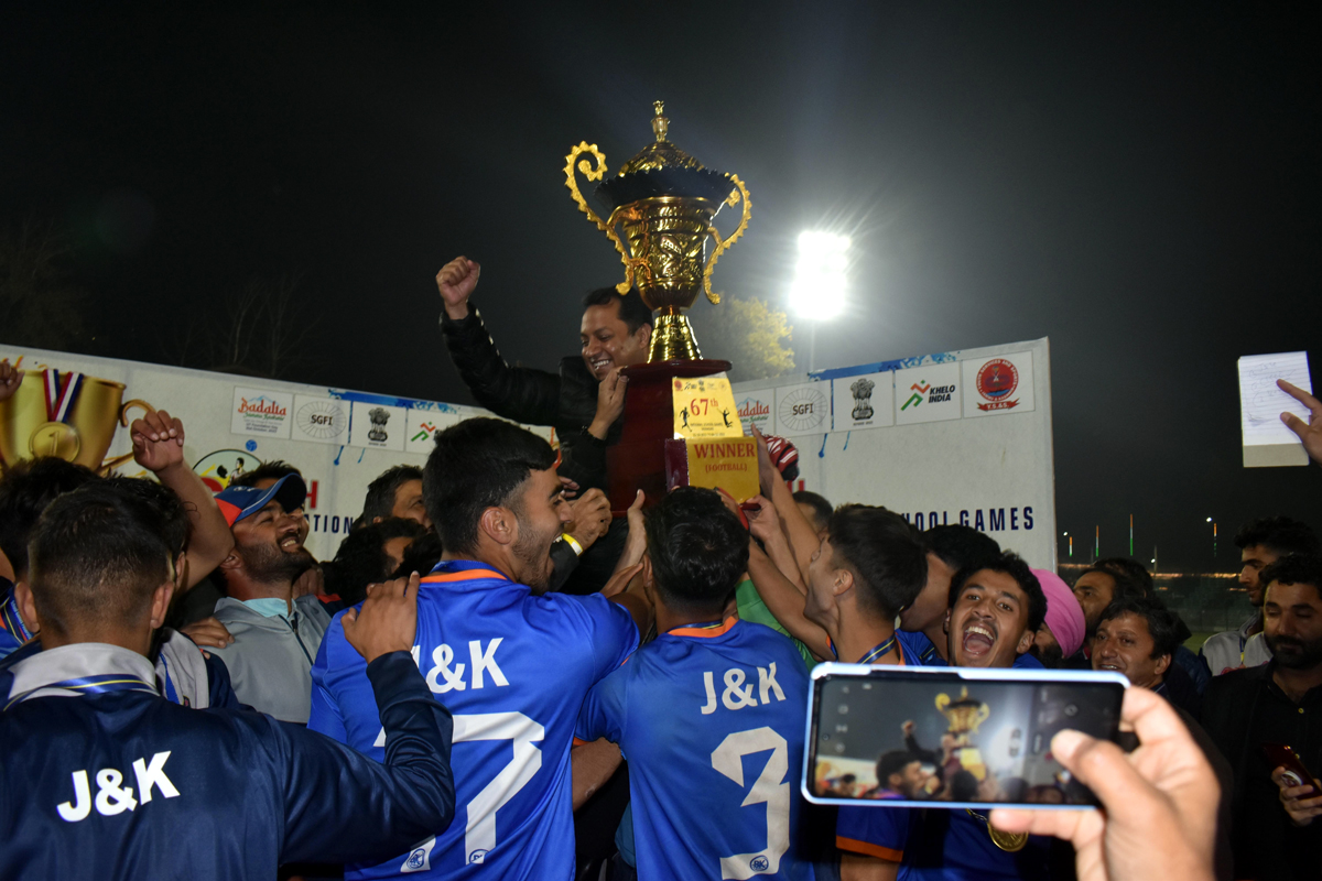 J&K Football team celebrating with winning trophy of National School Games. By Daily Excelsior - November 5, 2023 Share FacebookTwitterWhatsAppPinterestLinkedinCopy URLTelegramEmailTumblrReddItPrintKoo J&K Football team celebrating with winning trophy of National School Games. J&K Football team celebrating with winning trophy of National School Games. Follow our WhatsApp channel