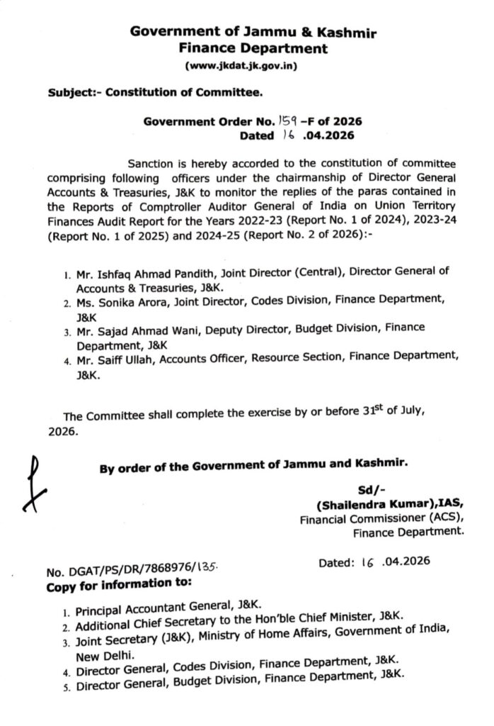 J&K Government Forms Special Committee To Review Audit Reports By Daily Excelsior - April 16, 2026 Share FacebookTwitterWhatsAppPinterestLinkedinCopy URLTelegramEmailTumblrReddItPrintKoo JAMMU, Apr 16: The Jammu and Kashmir Finance Department has set up a high-level committee to track and respond to findings in the Comptroller and Auditor General (CAG) reports for the last three financial years. Follow our WhatsApp channel