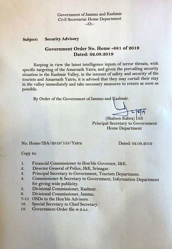 J&K govt advises Amarnath pilgrims and tourists in Kashmir to return as soon as possible By Daily Excelsior - August 2, 2019 Share FacebookTwitterWhatsAppPinterestLinkedinCopy URLTelegramEmailTumblrReddItPrintKoo Srinagar: J&K govt issues security advisory in the interest of Amarnath pilgrims and tourists, “that they may curtail their stay in the Valley immediately and take necessary measures to return as soon as possible Follow our WhatsApp channel