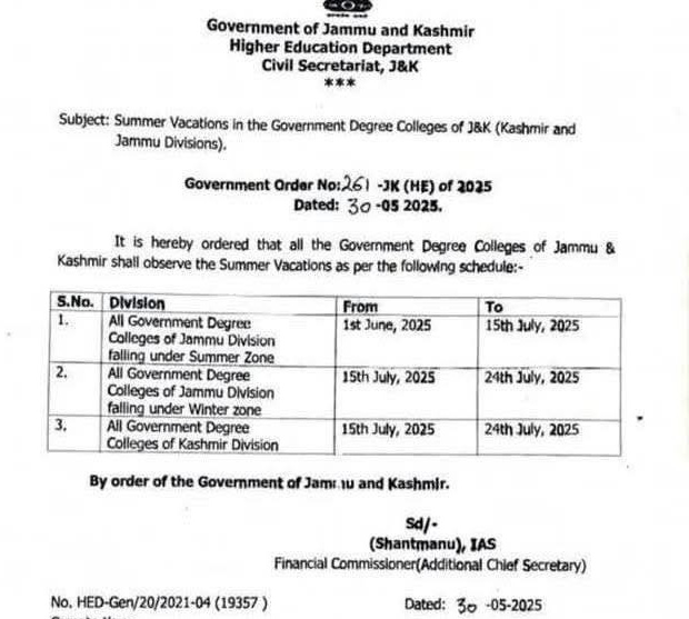 JAMMU, May 30: The Higher Education Department of the Jammu and Kashmir Government today announced summer vacations for the degree colleges of the UT.