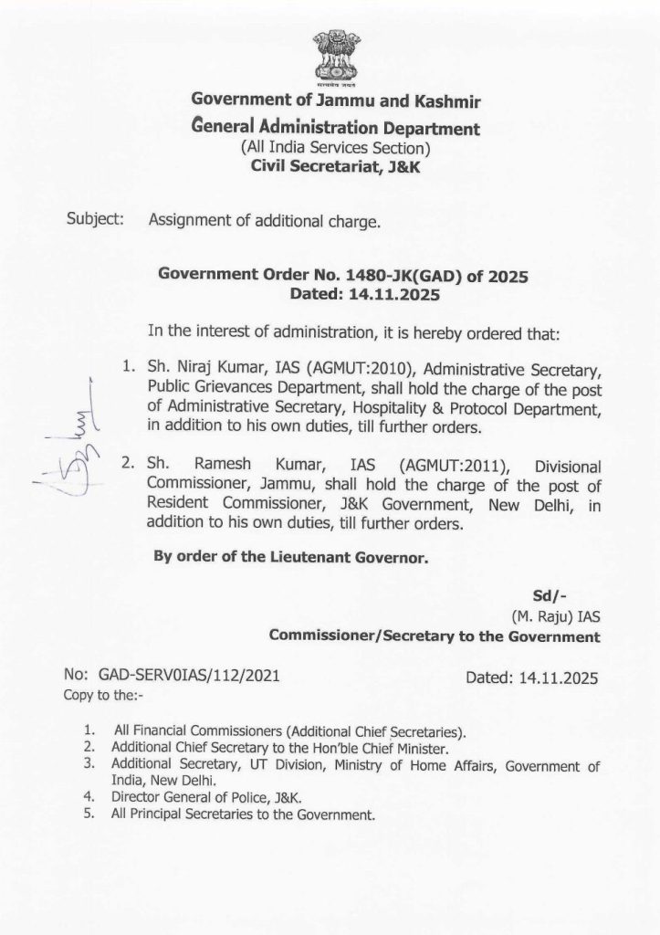 Likewise, Divisional Commissioner Jammu, Ramesh Kumar has been assigned the additional charge of Resident Commissioner, J&K Government, New Delhi.