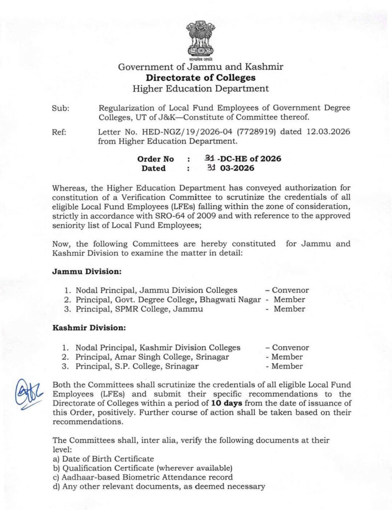 JAMMU, Apr 8: The Jammu and Kashmir Government has constituted divisional-level committees for verification and regularization of Local Fund Employees (LFEs) working in Government Degree Colleges across the Union Territory.