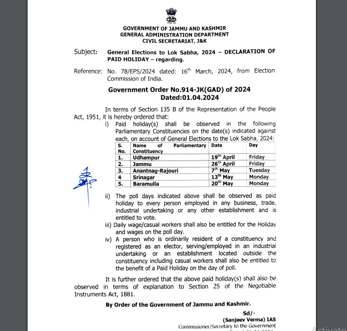 According to the order, April 19 will be a holiday in Udhampur Lok Sabha constituency, April 26 in Jammu constituency, May 7 in Anantnag-Rajouri constituency, May 13 in Srinagar constituency and May 20 in Baramulla constituency.
