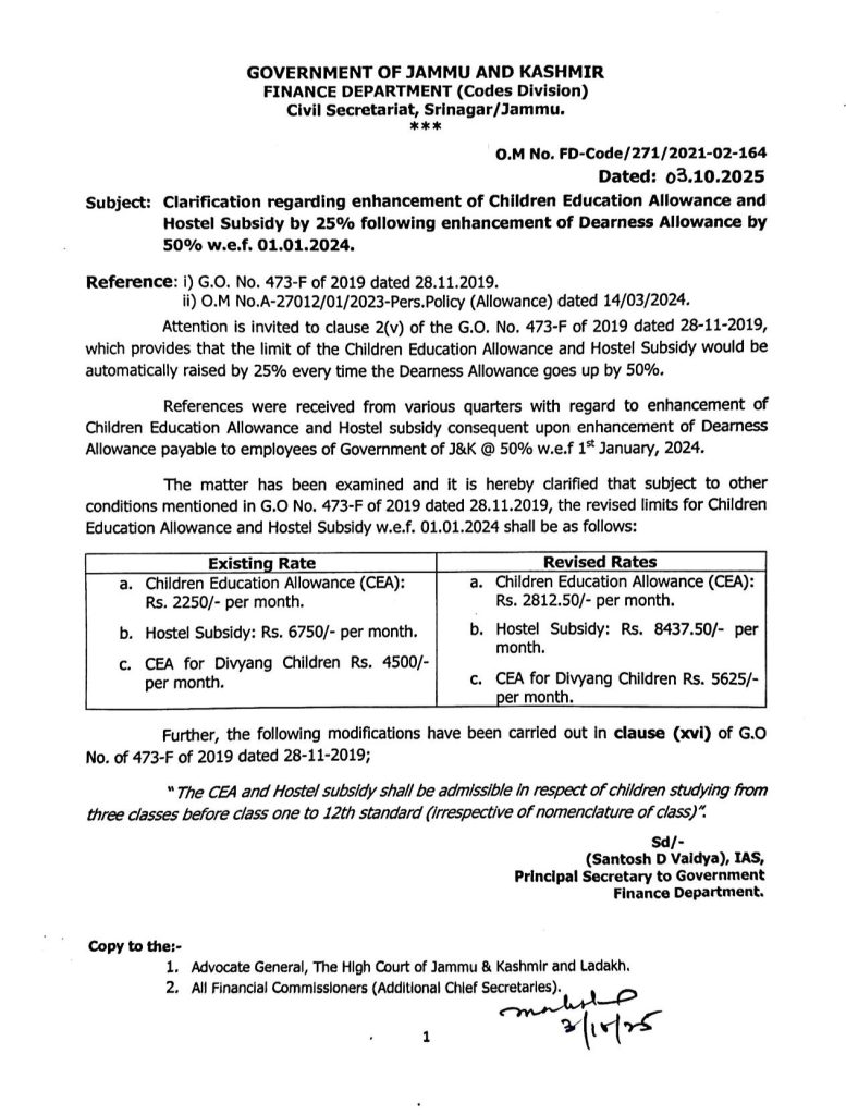 Jammu, Oct 3: The Jammu and Kashmir Finance Department has announced a 25 percent increase in the Children Education Allowance (CEA) and Hostel Subsidy for government employees following the enhancement of Dearness Allowance by 50 percent from January 1, 2024.