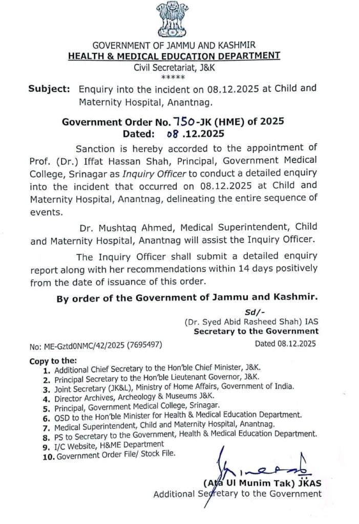 JAMMU, Dec 8: The Jammu and Kashmir Government today appointed Prof (Dr) Iffat Hassan Shah, Principal of Government Medical College Srinagar, as the Inquiry Officer to probe the incident that occurred on December 8 at the Child and Maternity Hospital in Anantnag.