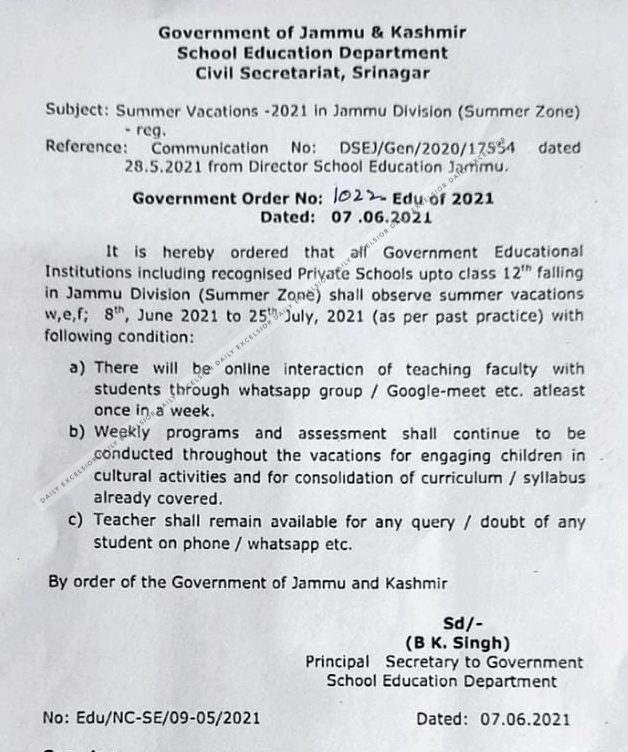 Issuing the summer vacation order for summer zone schools, Principal Secretary in School Education department B K Singh, however, said there would be online interaction of teaching faculty with students at least once in a week.