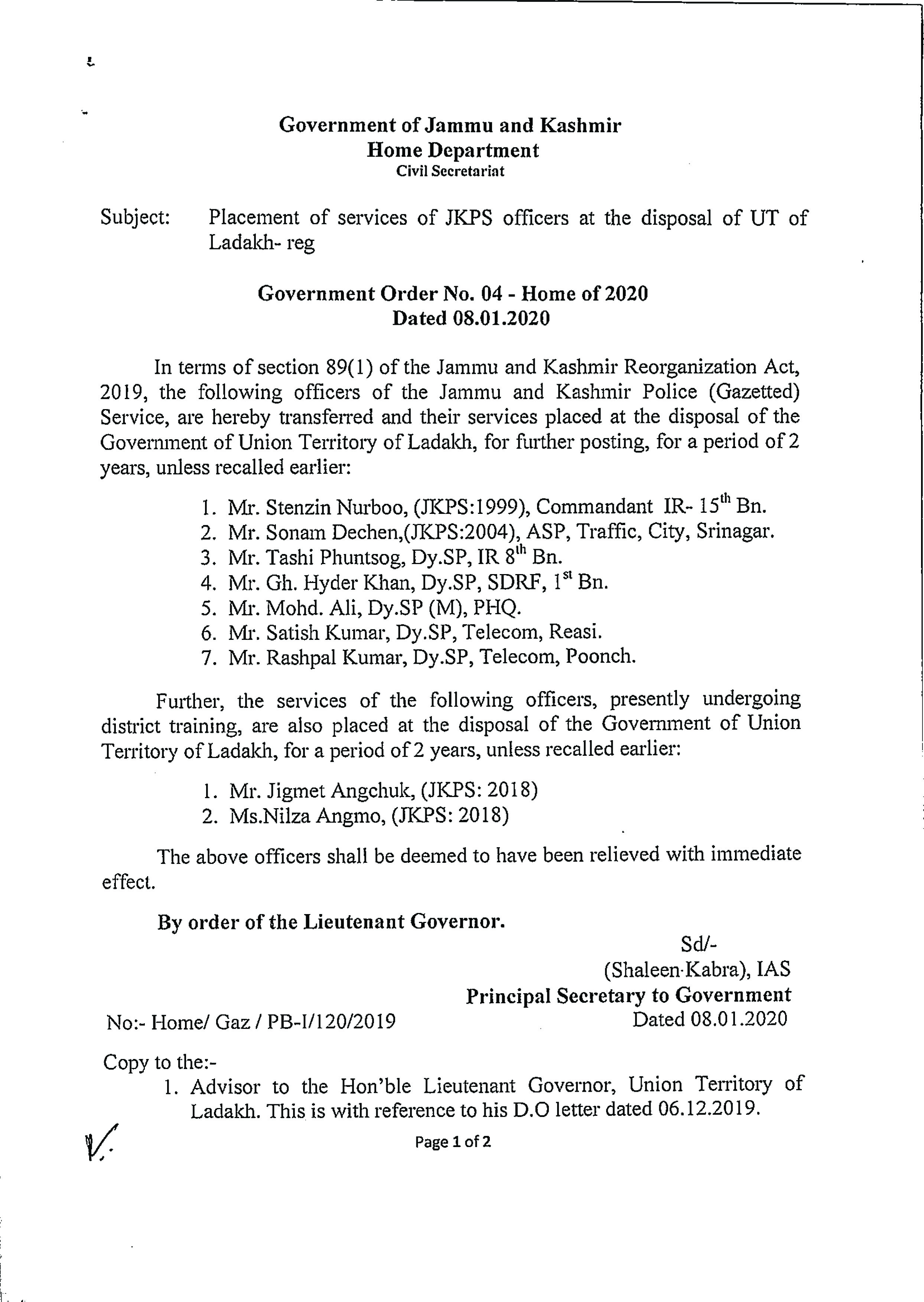 J&K Govt orders transfer of JKPS Officers to UT of Ladakh By Daily Excelsior - January 9, 2020 Share FacebookTwitterWhatsAppPinterestLinkedinCopy URLTelegramEmailTumblrReddItPrintKoo Follow our WhatsApp channel