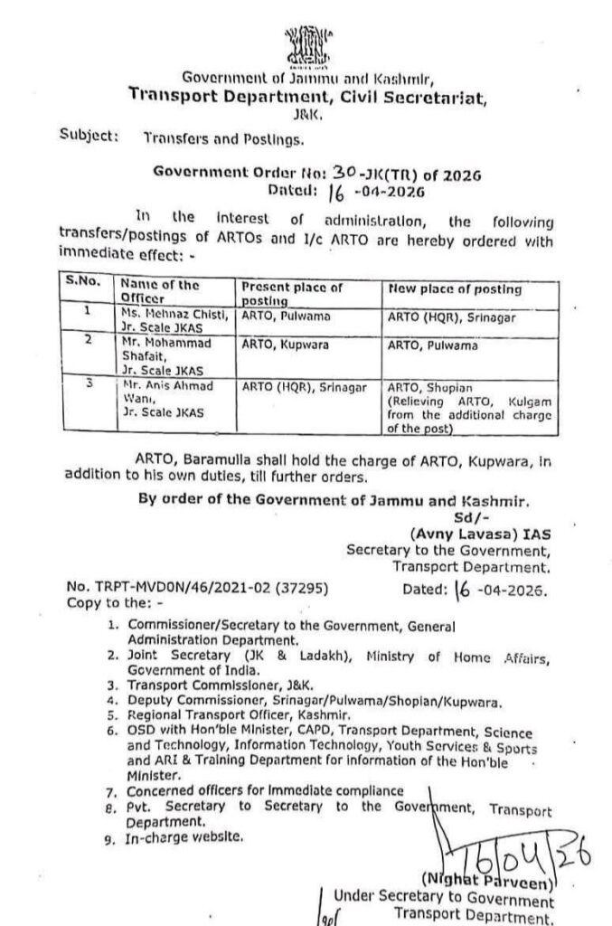 JAMMU, Apr 16: The Transport Department of the Jammu and Kashmir Government has ordered the transfer and posting of three ARTOs in the interest of the administration.