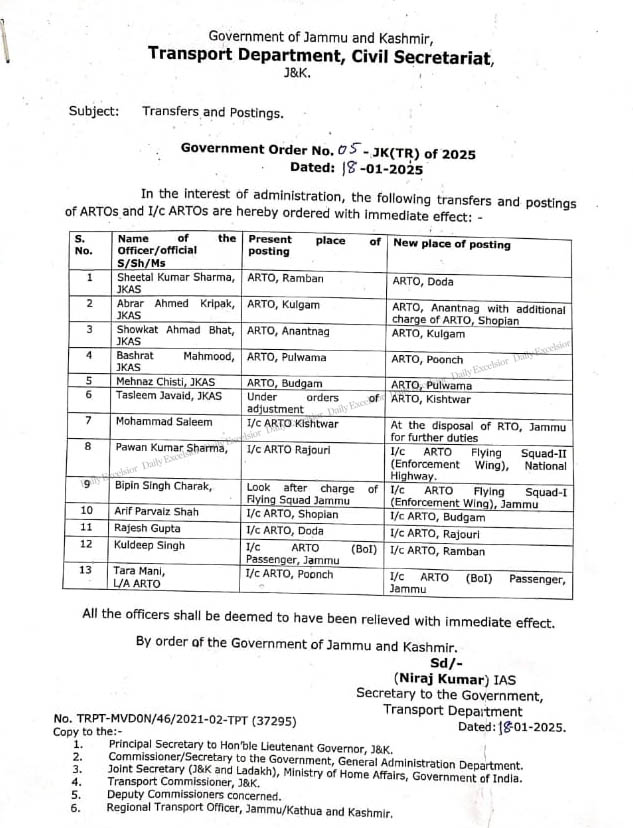 Mohammad Saleem has been posted at the disposal of RTO, Jammu for further duties, Pawan Kumar Sharma has been posted as I/C ARTO Flying Squad-II (Enforcement Wing), National Highway, Bipin Singh Charak I/c ARTO Flying Squad-I (Enforcement Wing), Jammu, Arif Parvaiz Shah I/c ARTO, Budgam, Rajesh Gupta I/c ARTO, Rajouri, Kuldeep Singh I/C ARTO, Ramban and Tara Mani, L/A ARTO I/C ARTO (BOI) Passenger, Jammu.