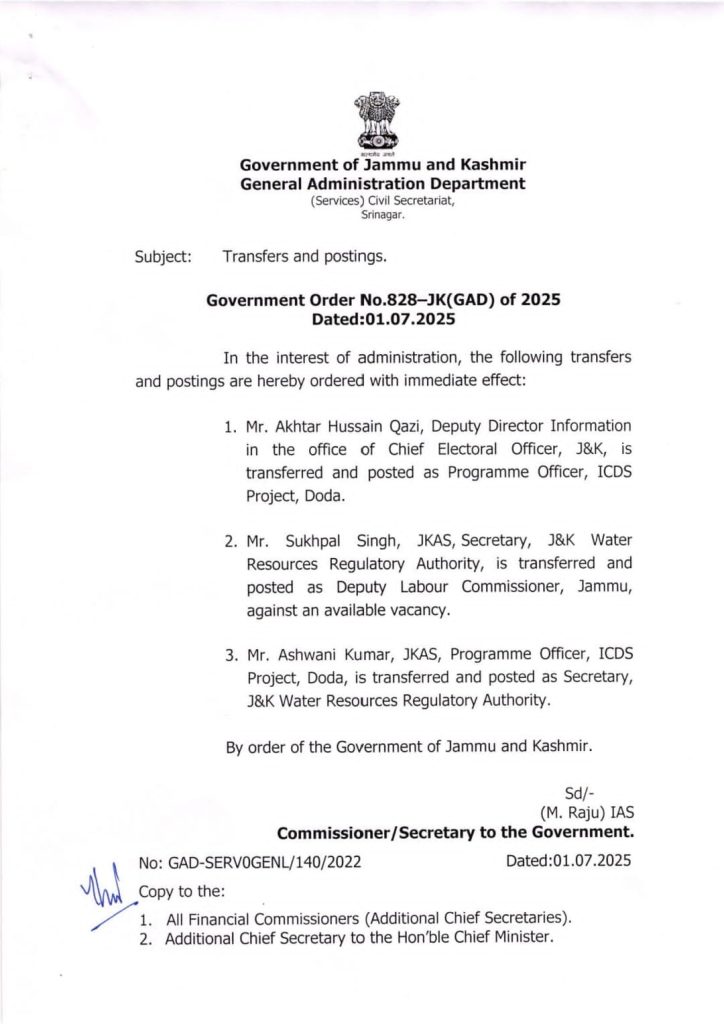 J&K Govt Transfers Three Senior JKAS Officers By Daily Excelsior - July 1, 2025 Share FacebookTwitterWhatsAppPinterestLinkedinCopy URLTelegramEmailTumblrReddItPrintKoo JAMMU, Jul 1: The Jammu and Kashmir Government has ordered the transfers and postings of three senior JKAS officers. Read this order for more details Follow our WhatsApp channel