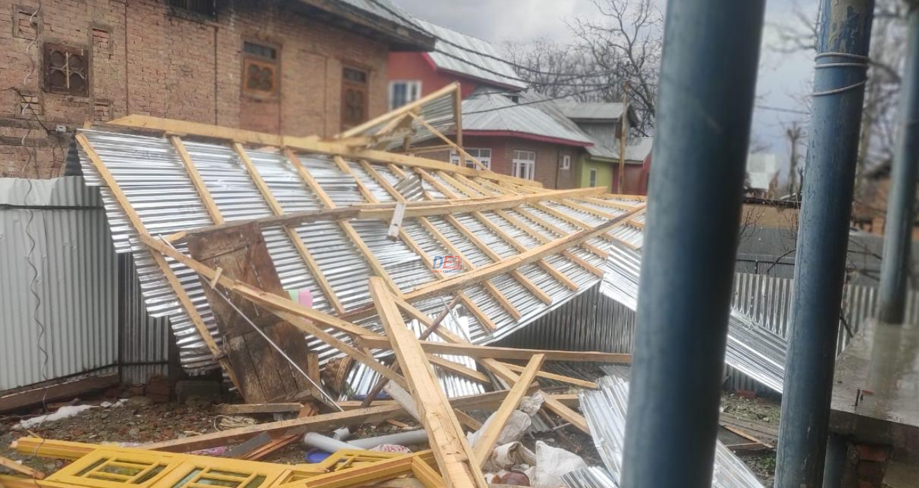 An official said that strong winds damaged a rooftop of a house and shops in Nowgam village today morning.