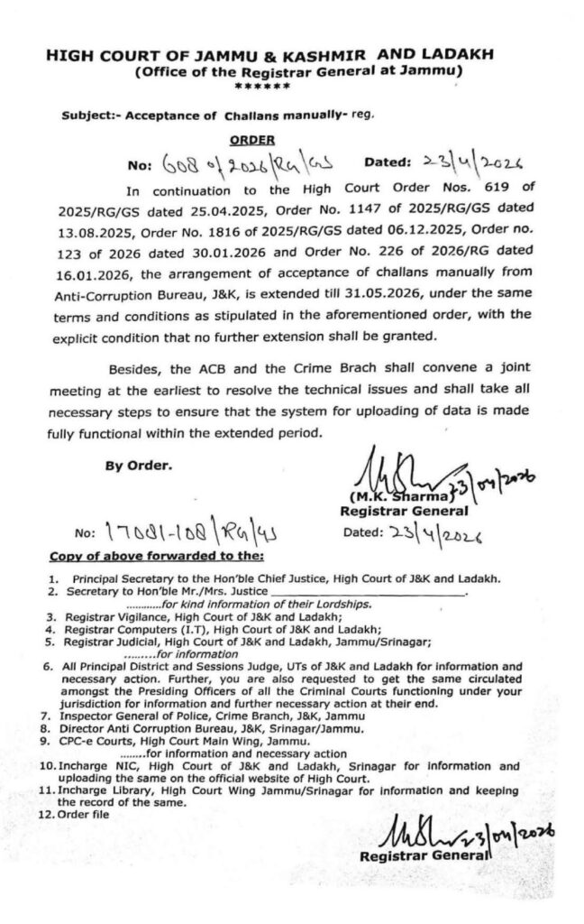 JAMMU, Apr 23: The High Court of Jammu & Kashmir and Ladakh has extended the arrangement for manual acceptance of challans from the Anti-Corruption Bureau (ACB), J&K till May 31, 2026.