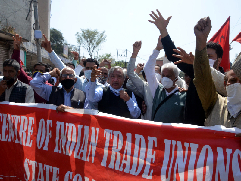 JAMMU, Mar 26: On the eve of Bharat Bandh, J&K Kissan Tehreek held protest demonstrations at Jammu and Srinagar demanding repeal of anti- farmer laws.