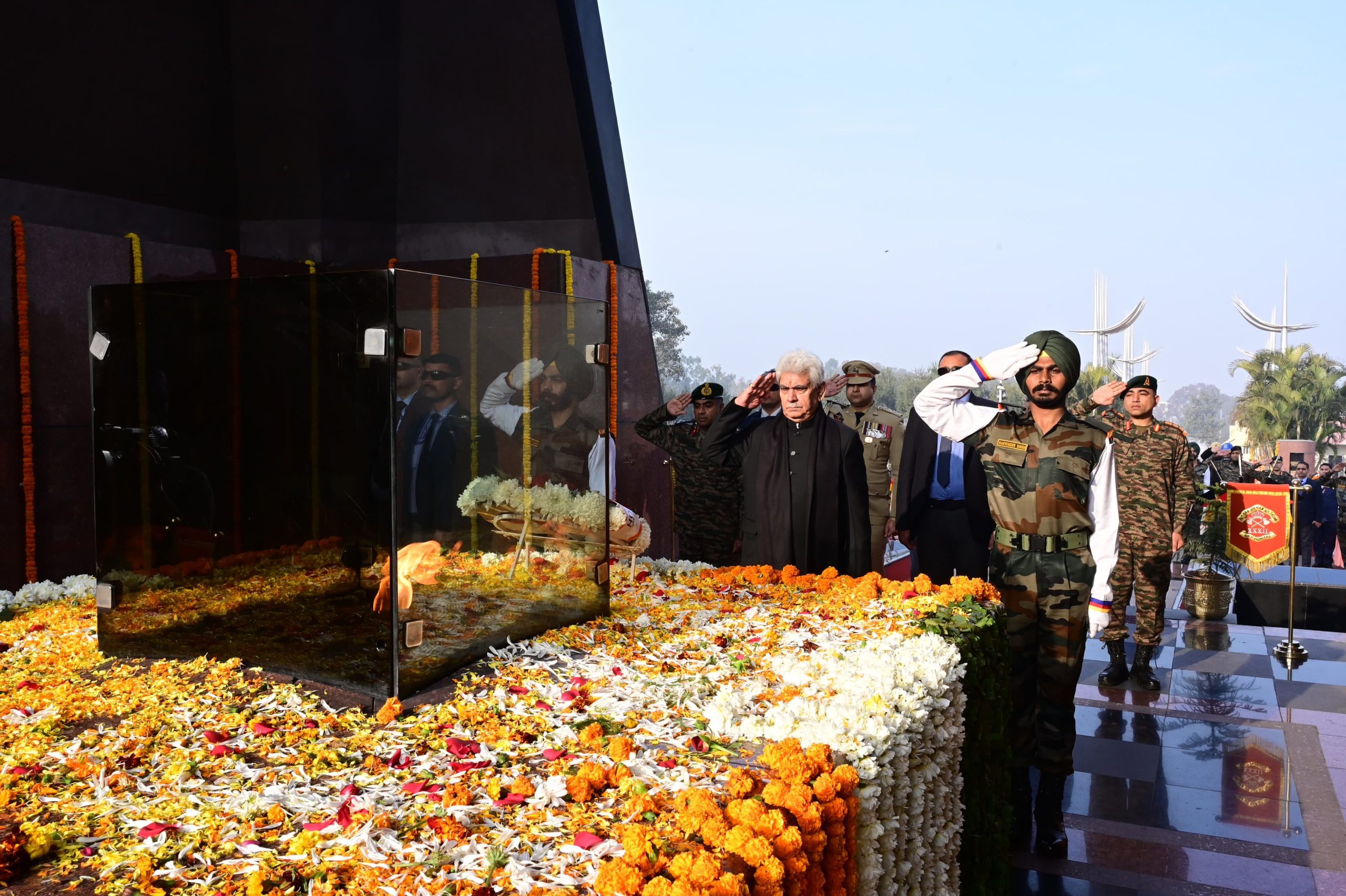 Jammu, Jan 26: Jammu and Kashmir Lieutenant Governor Manoj Sinha on Friday laid a wreath at the ‘Eternal Flame’ of the Balidan Stambh War Memorial in Jammu to pay tribute to the fallen heroes on the occasion of 75th Republic Day on Friday.