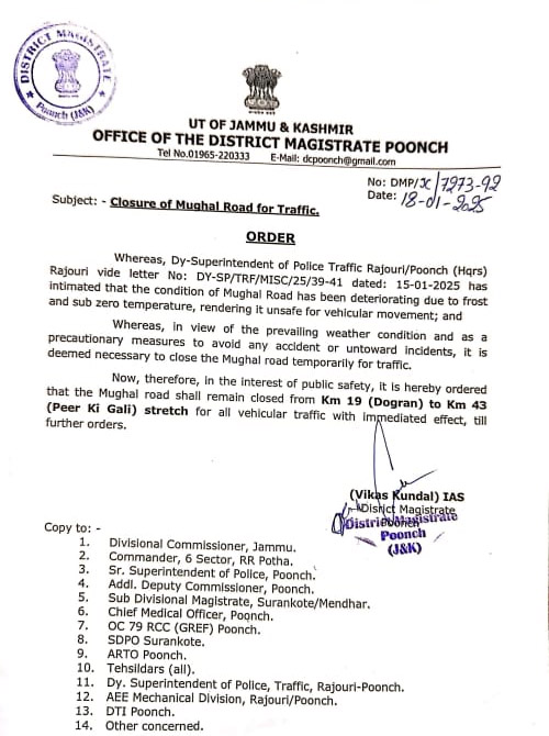 JAMMU, Jan 18: Authorities have ordered complete closure of Mughal road till further orders and a formal notification in this regard has been issued by District Magistrate Poonch.