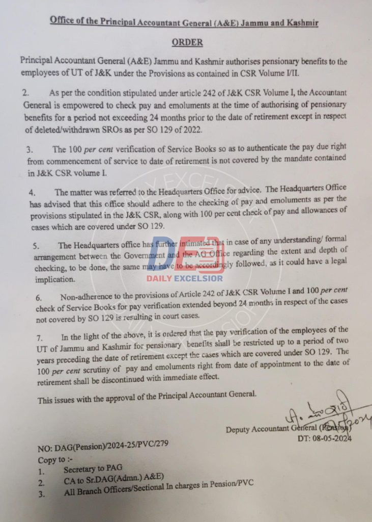 JAMMU, May 9: The Principal Accountant General (PAG) of Jammu and Kashmir has announced a significant change in the pay verification process for employees nearing retirement.