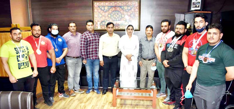 On their return from Gazipur and Coimbatore, the Secretary J&K Sports Council Nuzhat Gul, Dr Zaffer Iqbal Chief Accounts Officer J&K Sports Council, Riyaz Ahmed Administration Officer, Ajay Sharma general secretary and Rahul Sawhney senior vice president of the Association gave warm welcome to the medal winners here today.
