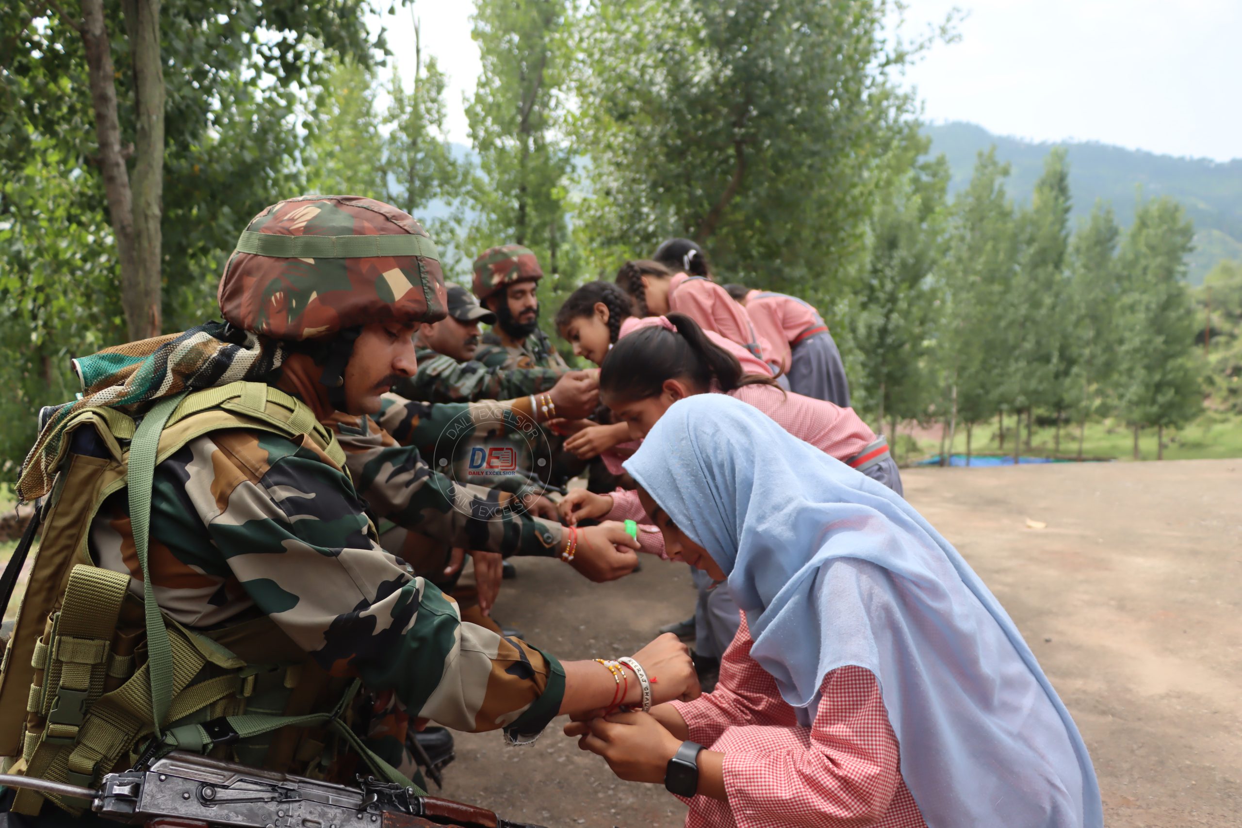JAMMU, Aug 30: Far away from their siblings on Raksha Bandhan, the security personnel posted on the frontiers got a taste of sibling love on Wednesday as local schoolgirls tied rakhis on their hands in a show of gratitude for the services they render to ensure civilian protection.