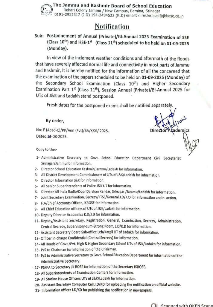JAMMU, Aug 31: The Jammu and Kashmir Board of School Education (JKBOSE) has postponed the Annual (Private)/Bi-Annual 2025 examinations of Class 10 (SSE) and Class 11 (HSE-1st) scheduled for September 1, 2025, in view of heavy rains and floods that have disrupted normal life and connectivity across J&K and Ladakh.