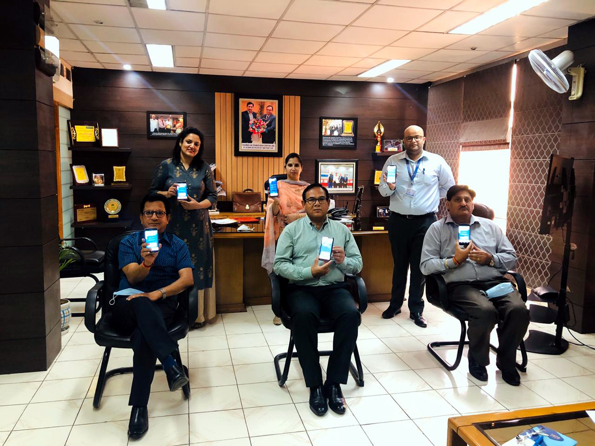 JKGB Chairman Janak Raj Angural along with other senior officers launching Bank’s Mobile Banking Application at Bank’s Head Office, Narwal in Jammu.