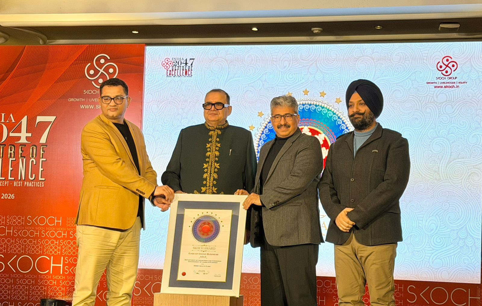 NEW DELHI, Jann 10:The Jammu and Kashmir Micro, Small and Medium Enterprises (JKMSME) Health Clinic, a flagship initiative of the Industries and Commerce Department, J&K, has been conferred with the prestigious SKOCH Gold Award in recognition of its impactful implementation and transformative contribution to the MSME sector at 104th SKOCH Summit held in New Delhi.