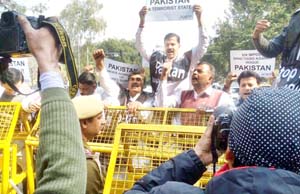 NEW DELHI, Feb 8: Admonishing Pakistan for its persistent cease fire violations along the IB and LoC in J&K besides its overt and covert support to secessionists in the Valley, JKNPP staged a massive demonstration outside Pakistan High Commission in New Delhi, here today.