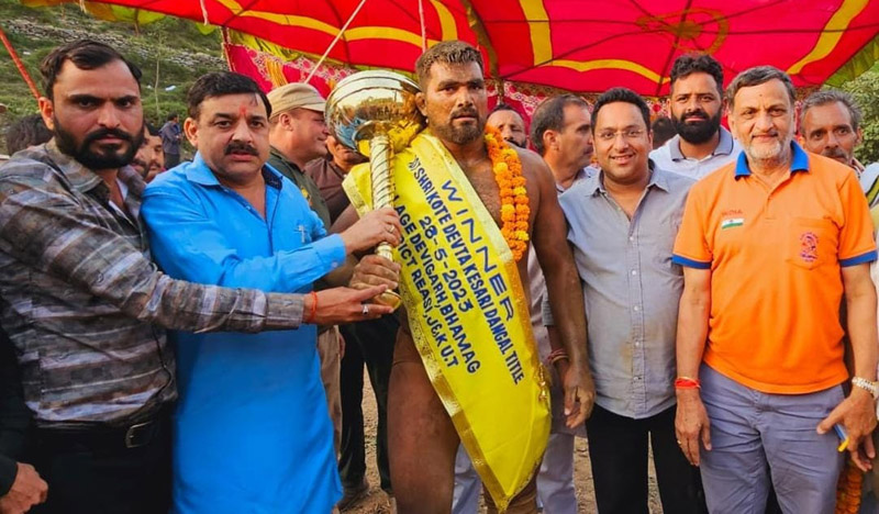 REASI, May 29: J&K Police (JKP) wrestler Bablu of Basantgarh (Akhara Roun Domail, Patha Rajinder Singh Ranyal) lifted 1st Shri Kote Devta Kesari Dangal Title by beating wrestler Babba of Kot Bhalwal Jammu (Akhara Domana) in a close contest that lasted for 19 minutes at Village Devigarh, Bhomag in district Reasi.