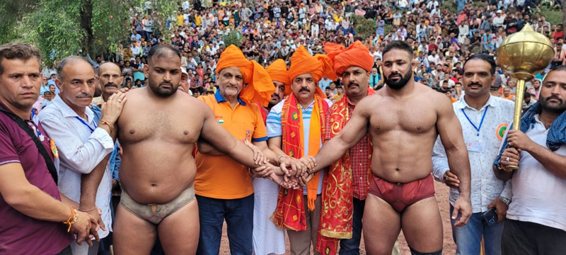 KATRA, Sept 4: Wrestler Benia Min of Jammu and Kashmir Police lifted 53rd annual Sujandhar Dangal title by defeating Wrestler Vikas of Haryana in the main first malli bout that lasted for 12 minutes at Village Sujandhar in Tehsil Bhomag of District Reasi here today. He was awarded with a cash amount of Rs 61,000 along with traditional Gurj and Mata Ki Chunari, while runner-up wrestler Vikas got Rs 50,000.