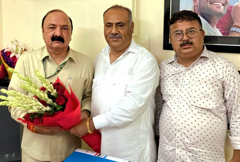 JAMMU, July 4: Rajnish Sharma (Mian), vice president and treasurer, JKPCC along with Vinay Gupta vice president DCC Jammu Urban met Member of Parliament from Amethi constituency Kishori Lal Sharma and congratulated him on his emphatic victory.
