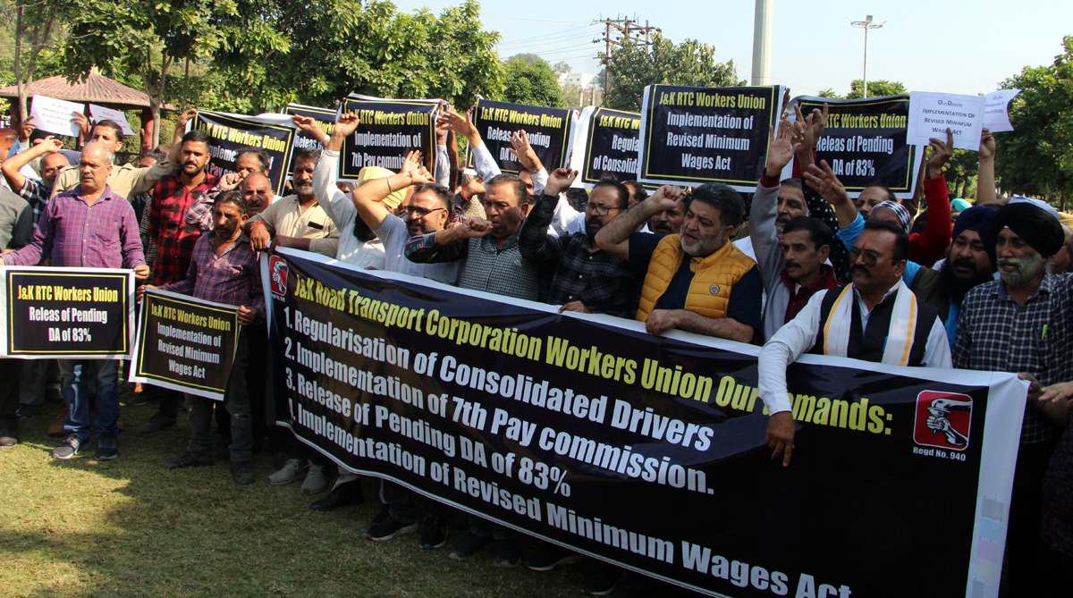 JAMMU, Oct 31: Projecting their demands like regularisation of consolidated employees and implementation of 7th Pay Commission recommendations, the J&K Road Transport Corporation workers today held strong protest demonstration here today.
