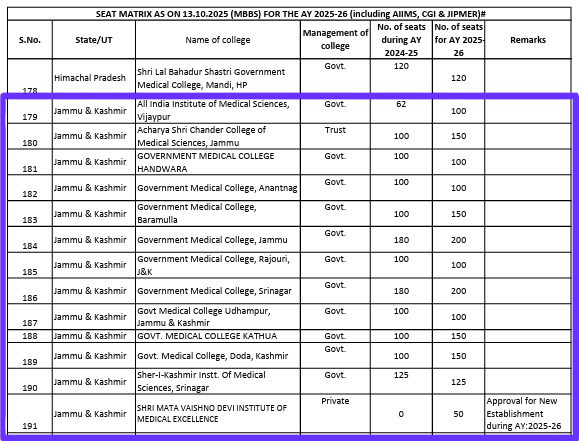 The Shri Mata Vaishno Devi Institute of Medical Excellence (SMVDIME) in Katra received 50 seats, taking the private total to 150.