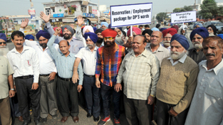 Addressing the large number of protestors, Gurdev Singh president JKSAC strongly critised both State and Central Govt for adopting delaying approach on the package. Over one year has passed but the State Government has not been taking up the issue properly with the Centre. He regretted that despite the lapse of one year period no concrete efforts have been made by State Govt to get the package sanctioned. It is learnt from the reliable sources that the file processed for the release of funds is still pending in the North Block at New Delhi.