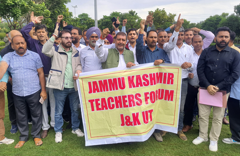 JAMMU, Oct 14: Up in arms against the alleged procrastinating attitude of the authorities in settling the GP Fund, Gratuity and Leave Salary cases of employees, the Jammu Kashmir Teachers Forum held protest demonstrations in Jammu & Srinagar to press for the prompt resolution of the issue.