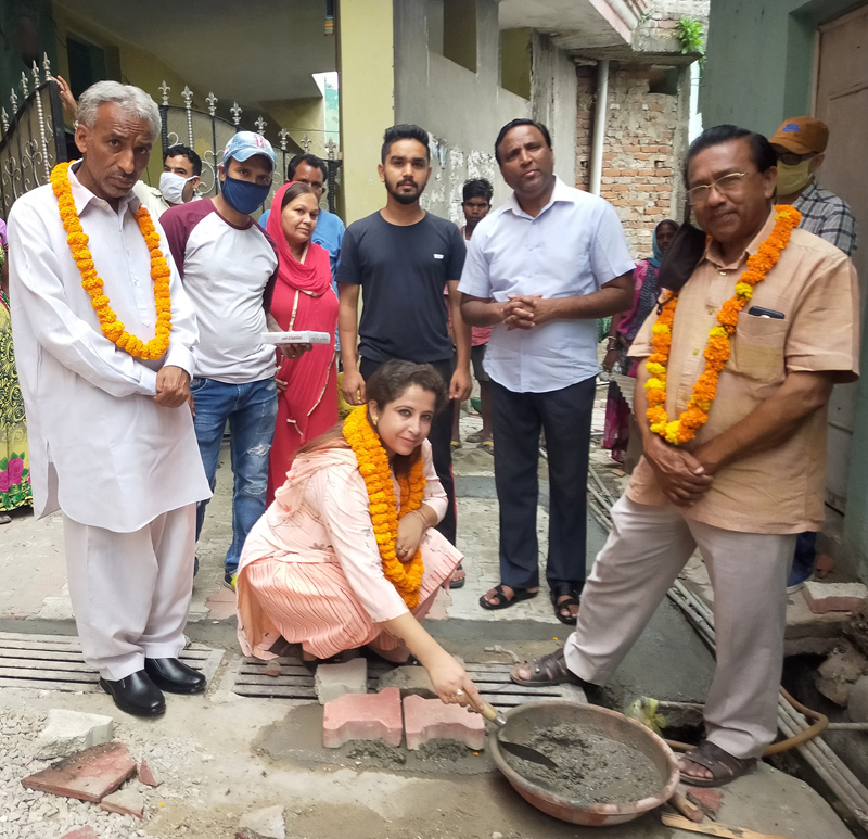 JMC Councillor, Ritu Choudhary starting tile work at Christian Colony in Jammu.