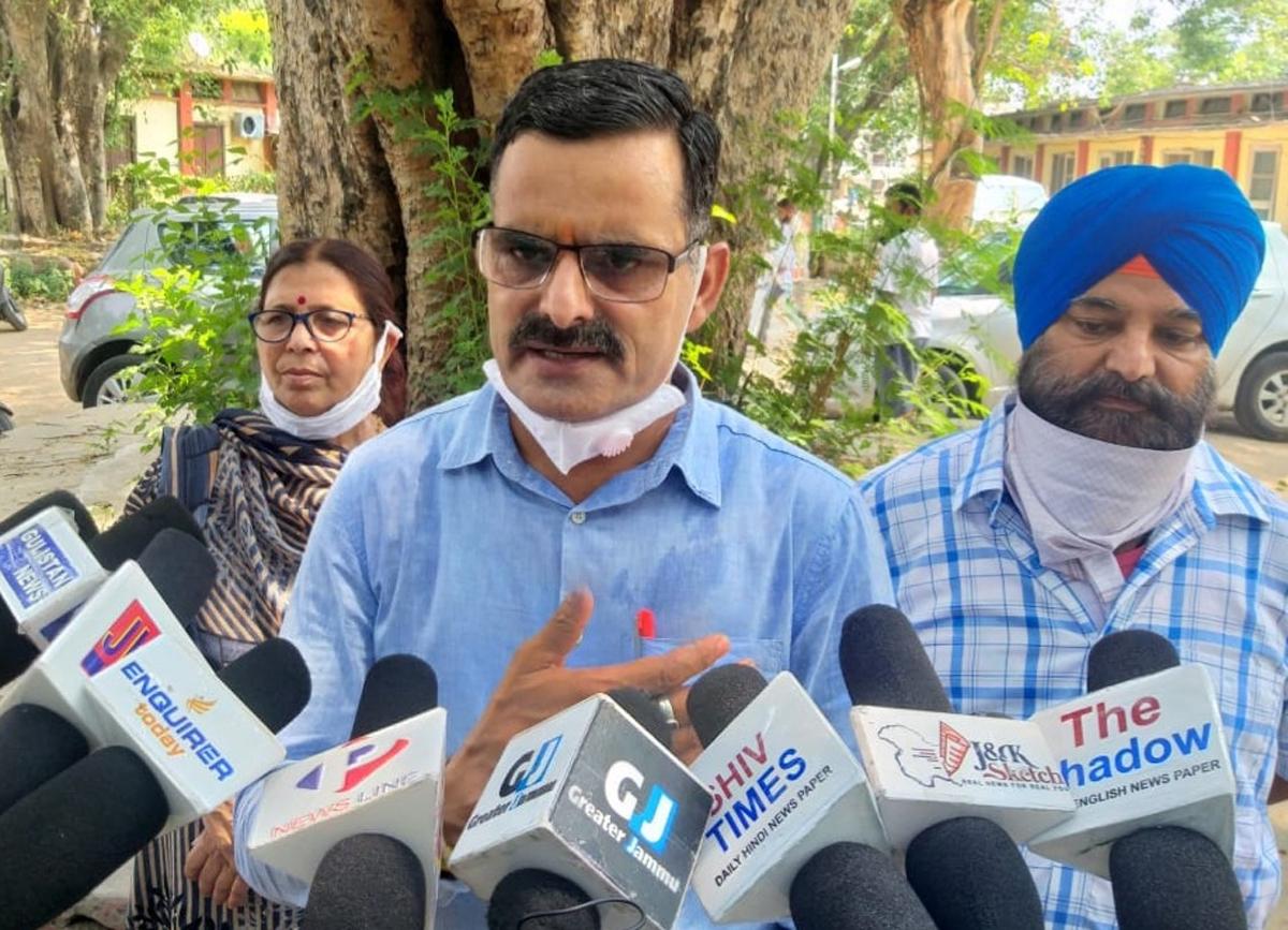 Corporator, Sanjay Baru at a press conference at Jammu on Friday.