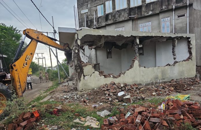 JAMMU, Oct 6: On the direction of the Commissioner, Jammu Municipal Corporation (JMC), Dr. Devansh Yadav and under the direct supervision of the Joint Commissioner (R&E) Subah Mehta and Deputy Commissioner (South) JMC Lal Chand, the JMC enforcement wing today carried out a major demolition drive against the building structures constructed without requisite permissions, reaffirming its commitment to ensuring planned and lawful urban development in the city.