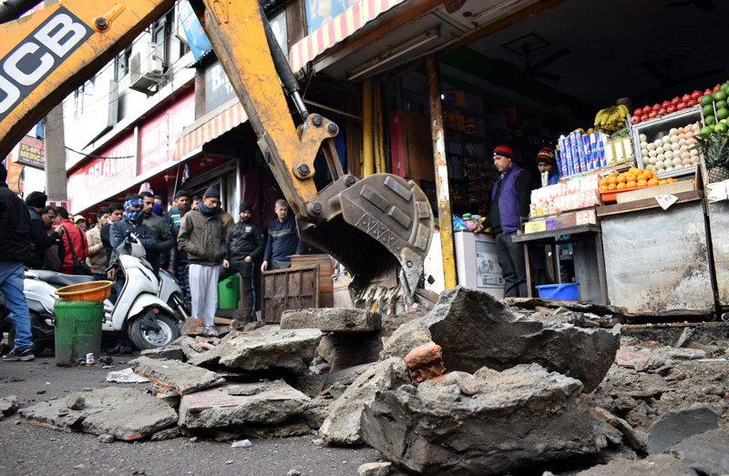 JAMMU, Jan 8: To further intensify the anti encroachment drives, Jammu Municipal Corporation (JMC) along with officers of Deputy Commissioner Office, Jammu and Police conducted an anti-encroachment drive in the areas like Gumat, Dogra Chowk, Jewel Chowk, Vivekanand Chowk near Riviera Hotel and adjoining areas here today in order to ease traffic congestions and ensure free movement of pedestrians on footpaths.