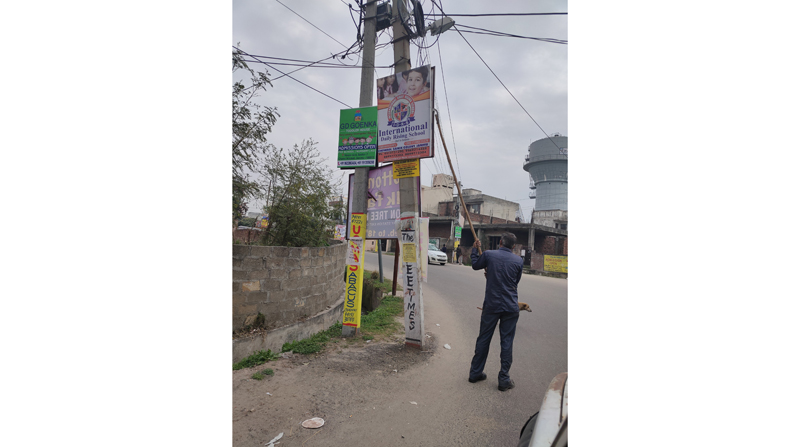 Employee of JMC removing illegal billboards installed along roadside in Jammu.