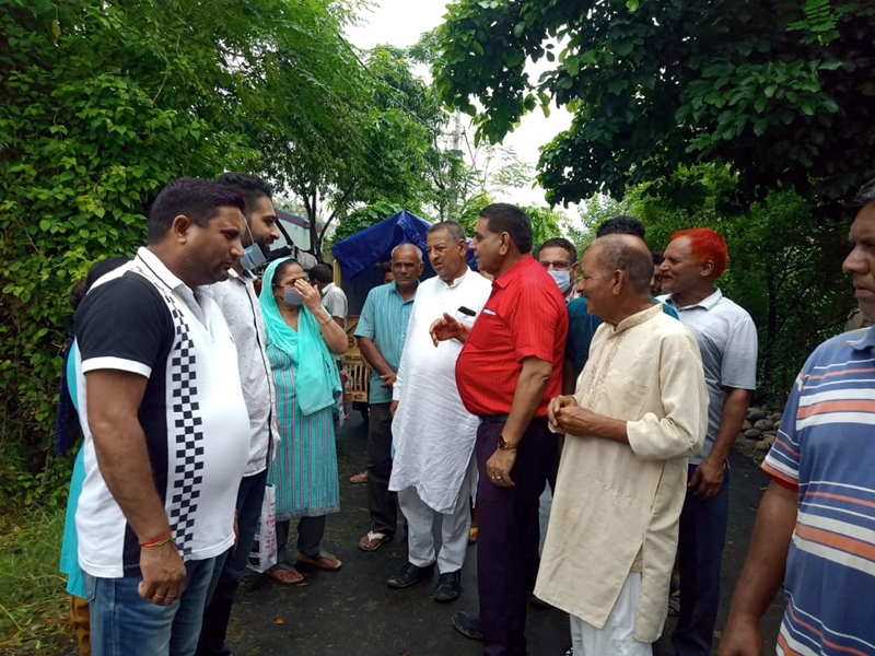 JAMMU, July 27: Jammu Municipal Corporation (JMC) Mayor, Chander Mohan Gupta along with Narinder Singh Jamwal, Chairman Health and Sanitation Standing Committee JMC today conducted extensive tour of Nai Basti near Lower Muthi and Anand Nagar Bohri of Ward 61 and 67 and took stock of the situation arisen due to continues rain and overflowing of deep drains.