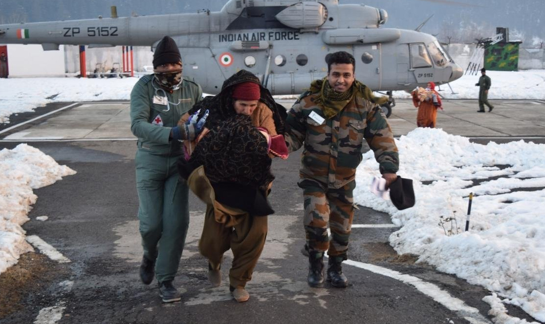 KUPWARA: The Indian Army and Indian Air Force conducted a joint evacuation operation in Tangdhar, North Kashmir today. The operation, necessitated due to the closed Sadhna pass owing to heavy snowfall received in this region in the last three days, was executed on a war footing in order to save precious lives of the locals.