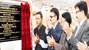 LEH July 18: The Minister for Urban Development and Local Bodies, Nawang Rigzin Jora along with CEC, LAHDC, Leh, Rigzin Spalbar laid the foundation stone of Multipurpose Indoor Stadium here today.